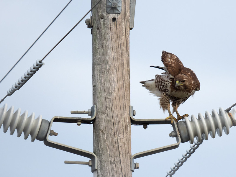 Some other birds of prey will hover and soar, taking a proactive approach to grocery shopping. But unless they’re quite hungry red-tailed hawks use a wait-and-see strategy. They have keen vision so a telephone pole provides an excellent vantage point to watch for the movement of small mammals below, and standing uses fewer calories than flying.
