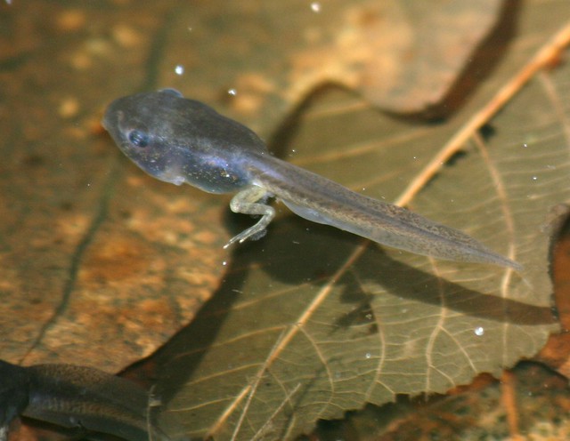 But, assuming there aren’t any bar brawls, the female will lay large masses of 1500+ eggs, choosing a site where they receive sunlight and protection from predators. When she releases her eggs, the male—who has been waiting for this opportunity and is now in the perfect position—fertilizes them with a sperm-containing fluid and soon the eggs begin to develop. Eventually, the tadpoles hatch and begin their metamorphosis, absorbing the nutrient reserves in their tails to fuel their makeover.