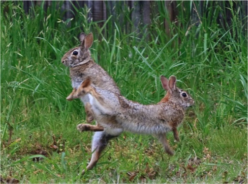 cottontail courtship 2Once the mating ritual (which also includes a little boxing, just to keep things interesting) is complete, 1-12 kits are born approximately 28 days later. A doe will often mate again within hours of giving birth—what a woman! Admittedly, since she’ll only visit the nest to allow the young ones to nurse, she’s not going to win any “most attentive mother” awards.