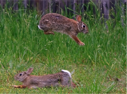 leaping cottontailsYou want to see a long jump? At first, 4.8 m (15’) may not sound like much compared to the current world record of 8.95 m (29.4’). But  consider this: a 15’ leap is 10x the average length of an adult cottontail’s body; 29 feet is barely 5x the average height of an adult American male.