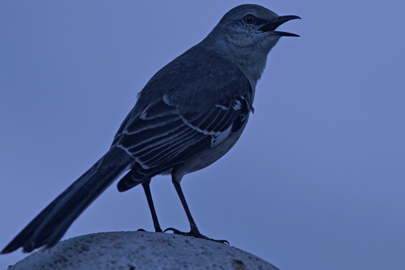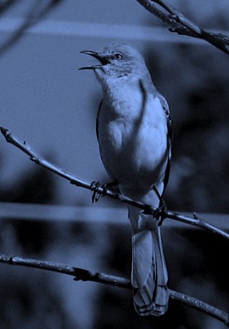 When awakened by birdsong it’s natural to assume that its the dawn chorus, even when it feels like mere minutes since your head hit the pillow, so as I surfaced from beneath the quilt I winced in anticipation of bright light.  The singing blared like a spotlight but the room was dark as a theater just before the curtain rises. That caused a moment’s confusion, followed by a quick glance at the alarm clock — 1:40am. Immediately, I was certain of the vocalist’s identity and his predicament as well: a young male Northern Mockingbird feeling lonely, or maybe just randy.