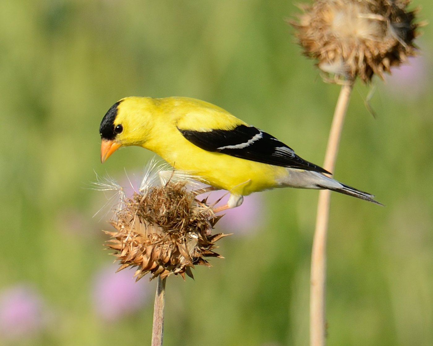 Found throughout the majority of North America for at least part of the year, and in about a third of the continent year-round, these smallish (4-5”) birds are regular visitors to backyards. In fact, suburban sprawl, which has proven so harmful to many wild species—neotropical migrant birds in particular—has been a boon for these devoted granivores. Goldfinches flock to places where thistle, sunflower, dandelion, cosmos, and aster seeds can be found, and development creates the perfect habitat for them and their favorite foods. The popularity of bird feeders hasn’t hurt either, since they provide seed-eaters with a competitive edge over birds that prefer other dining plans.