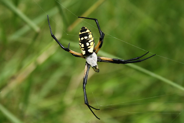 The impact caused some turbulence in other plans as well; specifically, those of the writing spider (Argiope aurantia) I was destined to meet. All I had to do was pull wisps of skywriting off my face, hair, and arms, and I was good to go. Charlotte faced a bigger clean up.