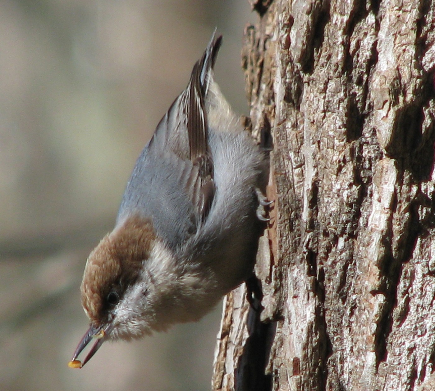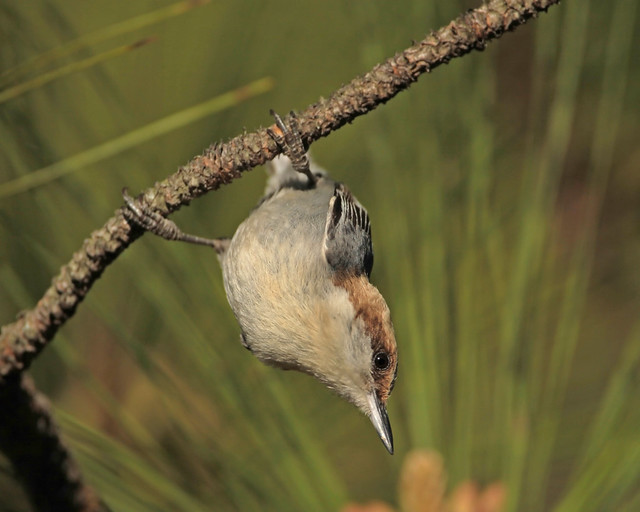 I’d never before met this non-migratory species, found year-round in pine forests throughout the southeast. However, while living in New Mexico I had a chance to became acquainted with some of the bustier members of the clan—the white-breasted (Sitta carolinensis) and red-breasted (Sitta canadensis) nuthatches*— so I immediately saw a family resemblance. Male and female brown-headed nuthatches share the same plumage—a handsome, understated pallet of topaz, slate and chalk. They are curious creatures, bolder than you might expect from a bird smaller than an index card, and not at all intimidated or shy around people. The voice is larger-than-life too, often sounding remarkably like an oversized rubber ducky. Disconcerting, when you’re not soaking in a tub of warm bubbles.