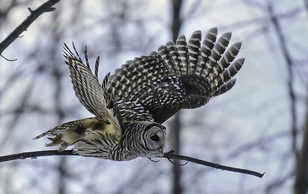 A round face, large liquid eyes, and a general I’m-not-fat-I’m-fluffy appearance give the barred owl a gentle countenance, but don’t be fooled. You know how territorial even the most homey, hospitable people can get when it comes to recipes, cookware, and all things related to food preparation? Then it should come as no surprise to you that this seemingly mild-mannered bird can boil over like the host of Hell’s Kitchen when defending its turf against interlopers. Aggression isn’t limited to their own kind either. Barred owls will shoo away the less assertive and near-threatened northern spotted owl (Strix occidentalis caurina) too, in parts of the Pacific Northwest where both species are found.