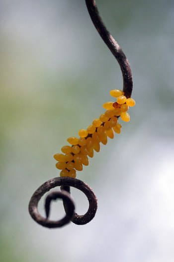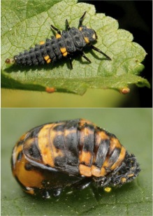 ladybug development stagesMetamorphosis is the name of the game among the six-legged set, and ladybugs are no exception. They start life as small, yellow, rice-shaped eggs usually deposited on the underside of leaves. When they hatch… well, I’m sure their parents are very proud, but these are not pretty babies. They don’t take after mom and dad until many awkward molts and a shrimp-like pupa stage have passed. But they do make themselves useful to humans even at this young age by chowing down on aphids, scale (Coccoidea), and mealybugs (Pseudococcidae).