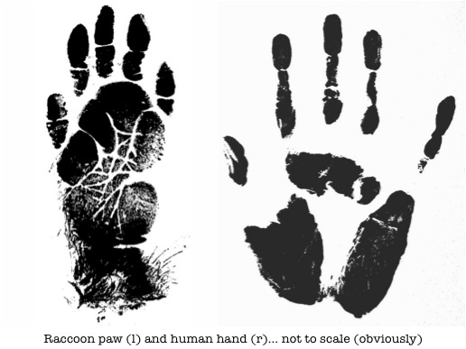 raccoon paw and human handFeet—humans and raccoons are both plantigrade. In other words, we walk with the entire foot planted firmly on the dirt… make that asphalt. There are other examples (elephants, kangaroos, and pandas come to mind), but the majority of mammals walk on their tippy toes (more on this in a future blog post).