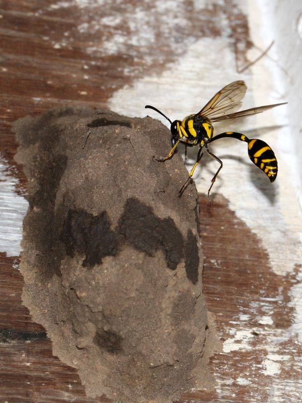 Paper wasps and yellowjackets will nest in trees, under building eaves, in walls, and just about any other place that offers some protection from the elements. Both types of wasp use chewed wood fibers as the main construction material, even when building underground, as yellowjackets often do.