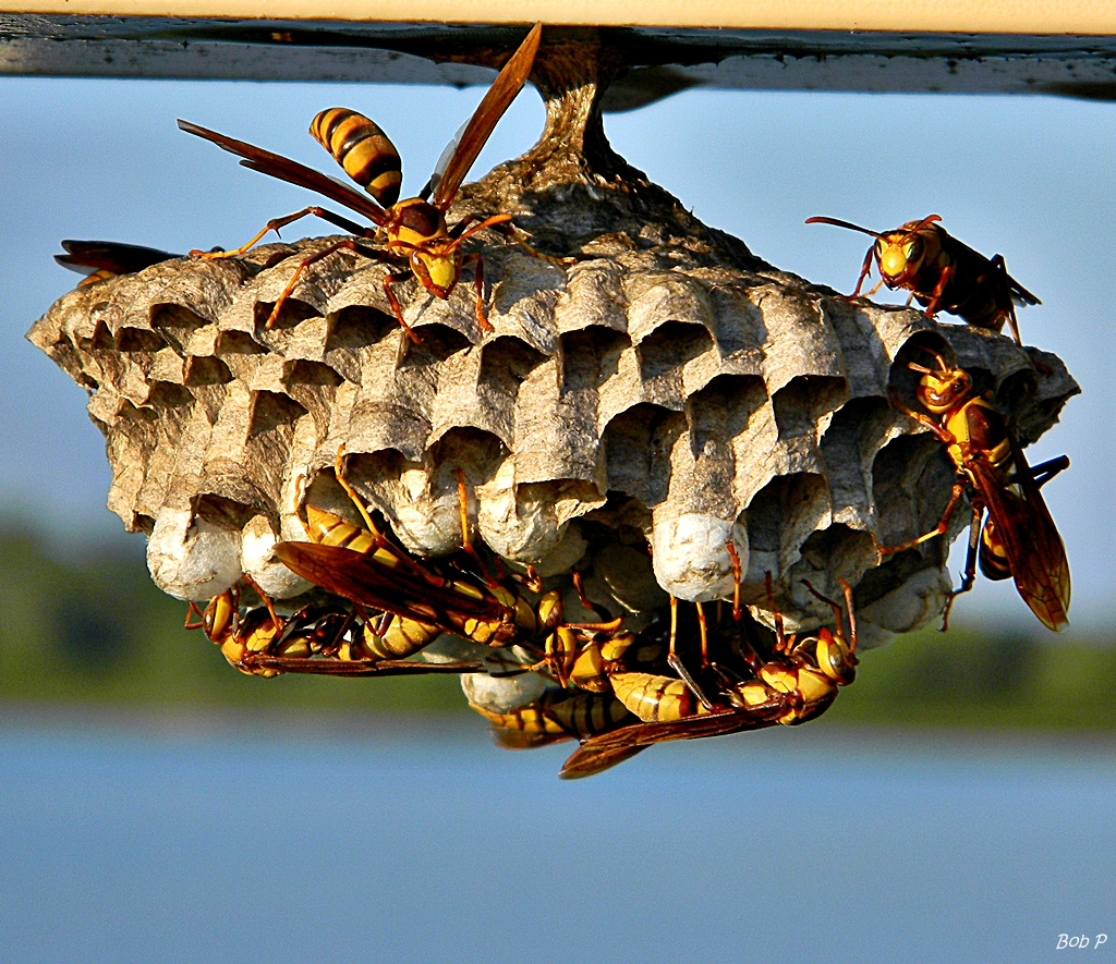Paper wasp combs attach with a single filament and consist of one tier of adjacent papery hexagonal brood cells for developing larvae. Each cell is open on one end so you can actually see the contents, if you choose (but please keep a safe distance. Better yet, just look closely at the opening photo above). Typically, a mature nest contains 20-30 adults and rarely grows to more than 200 cells. Paper wasps usually attack only when they or the nest is threatened, but they are territorial. As an interesting aside, the northern paper wasp (Polistes fuscatus) has extremely variable facial patterns and recent research suggests their facial recognition abilities are similar to those of humans and chimpanzees (Pan spp.). Obviously, individuality affords some benefit, even among drones—so much for faceless anonymity.