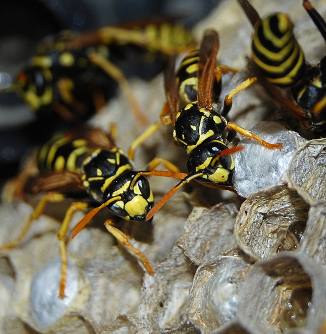 Yellowjackets prefer to raise their young in a kind of fortress that looks more like what we would think of as a hive, with layers and layers of brood cell combs. The whole structure is completely enclosed with the exception of a single entrance hole. Queens establish new colonies each spring, often returning to the site of a previous nest (the location is identified by a chemical scent marker recognizable even to a first-year queen). However, if the structure is particularly well-protected from the weather—in the wall of a house, say—it may become a perennial nest, populated year-round. Yellowjacket hives may range in size from several inches (at the beginning of the colony’s history) to enormous structures measuring six feet or more and housing as many as 20,000 adult workers.