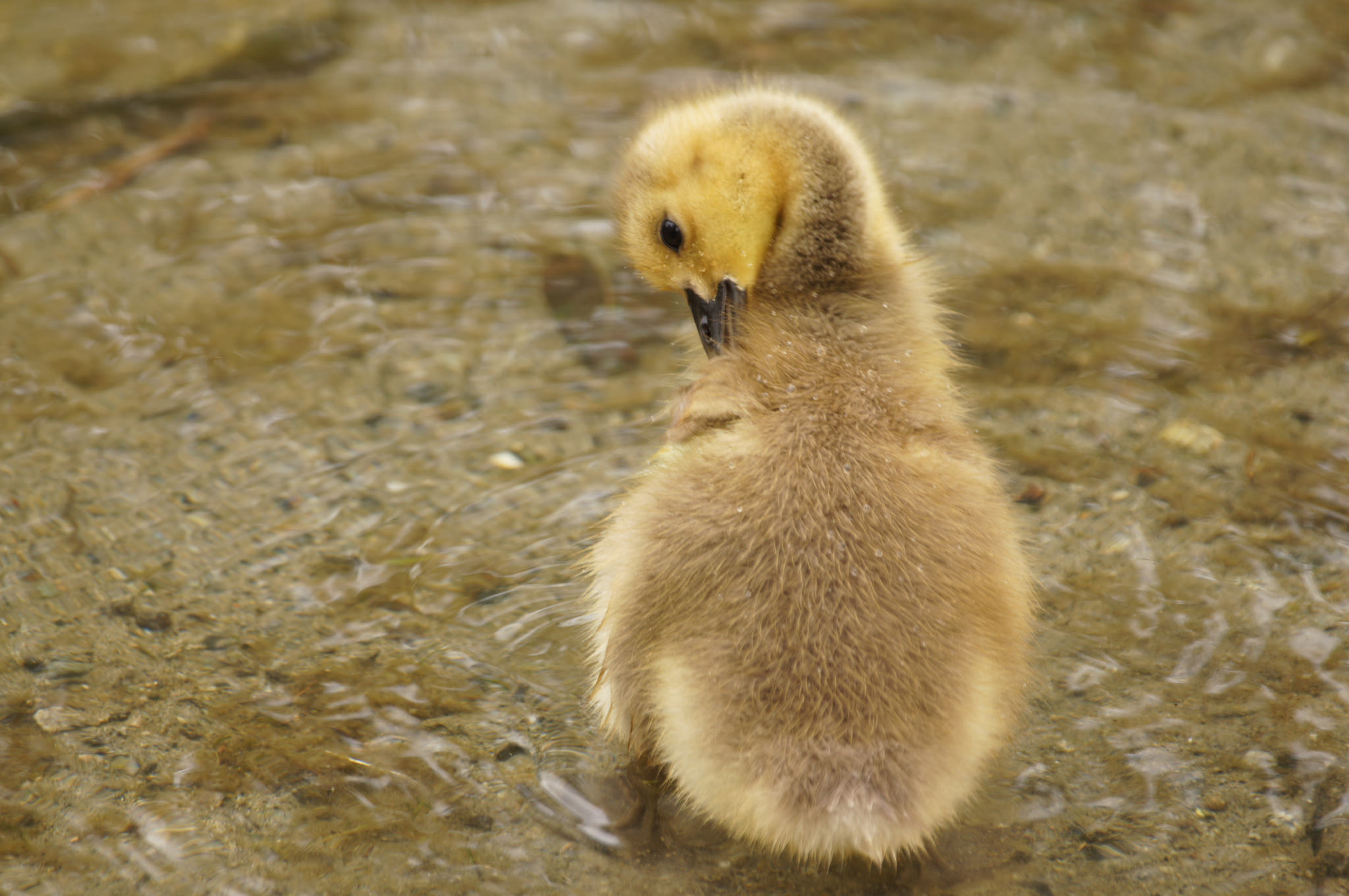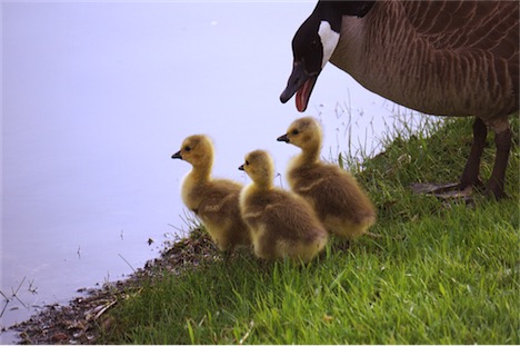 grazing gosling by Ray Morris, CCL…not to mention growing by leaps and bounds. Before long, it was time to strap on the black aviator helmet and take off!gosling chin-strap by Eric Bégin, CCLTheir first flights were brief and aquatic; buoyant new pilots seem to find over-water touch-and-go’s less intimidating. What’s the worse that can happen? You ditch, you get wet.  A bruised ego heals a lot faster than broken bones.