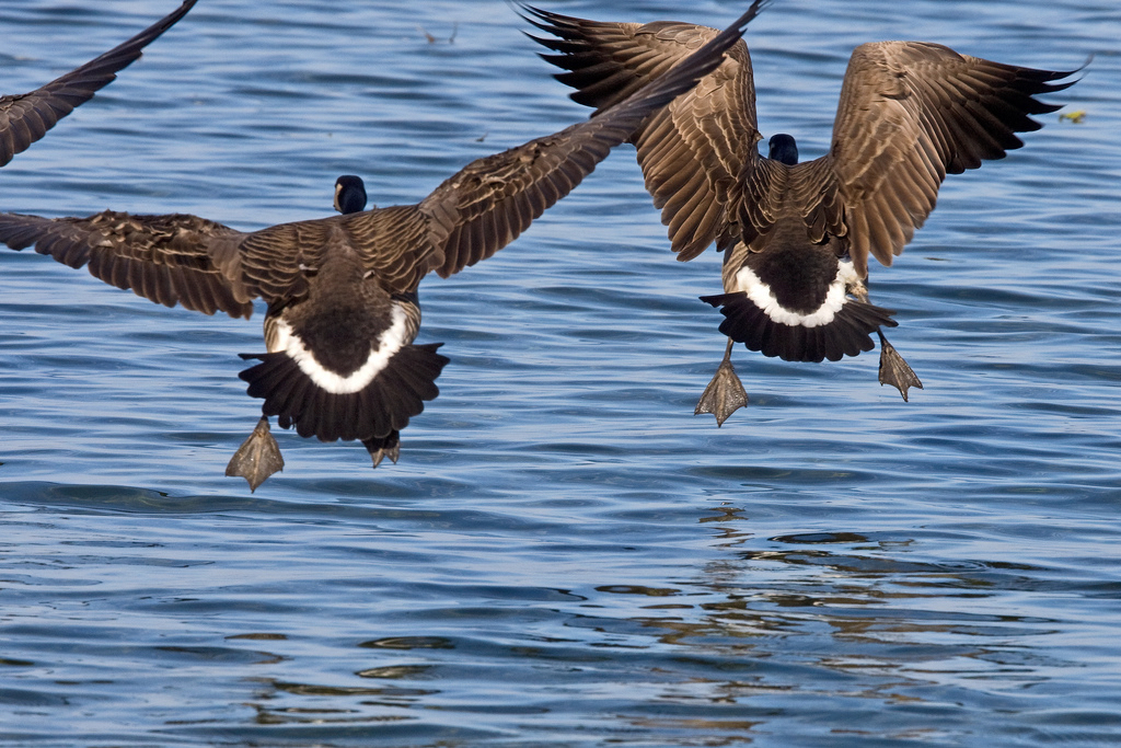 © 2015 Next-Door Nature—no reprints without written permission from the author (I’d love for you to share my work  but please ask). Thanks to these photographers for making their work available through a Creative Commons license (from top to bottom):  Gidzy (squadron in flight); Ingrid Taylar (downy); Rachel Kramer (drill sergeant); Eric Bégin (flotilla); Tjflex2 (preening); Jeremiah John McBride (calisthenics); Ray Morris (grazing goslings); Eric Bégin (aviator helmet); John Benson (water landingturf touchdown); essayru (missed turn); J. Michael Raby (morning flight).  Thanks also to Pam Parsons (big feet) for permission to use her photo.