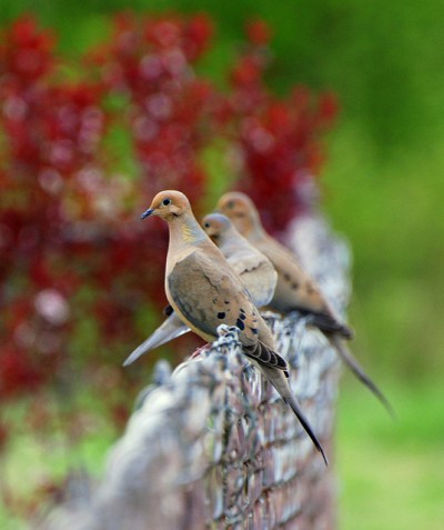 The end of the lovey-dovey breeding season shouldn’t bring on the lonesome blues either, because that’s when the community flocks together in a big way. They go on group picnics, gobbling up seed in open fields or from the ground beneath backyard feeders until their crops are full, then settle onto fences, or walls, or telephone wires to digest the meal and the days events. They go drinking together, although for doves that means sipping water from puddles and bird baths rather than throwing back with Jose Quervo at the neighborhood saloon.