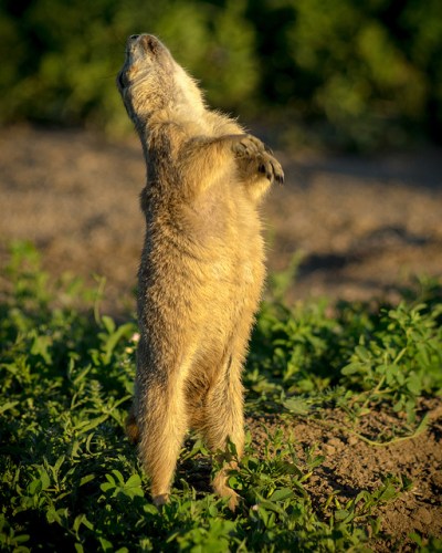 The social nature of a prairie dog town may explain a cultural phenomenon I think of as the Cynomys Wave. This conspicuous (and apparently contagious) behavior, also known as the jump-yip, begins when a single resident spontaneously stands on its hind legs, stretching up and back as if beginning a sun salutation asana. Instead of chanting OOOMMM, however, the creature let’s rip with a high-pitched WEE-OO, similar to the infamous yell that ended Howard Dean’s presidential aspirations . Then, in a scene reminiscent of a circa 1977 football stadium, the whole town jumps up to do The Wave, squealing like demonic dolphins.