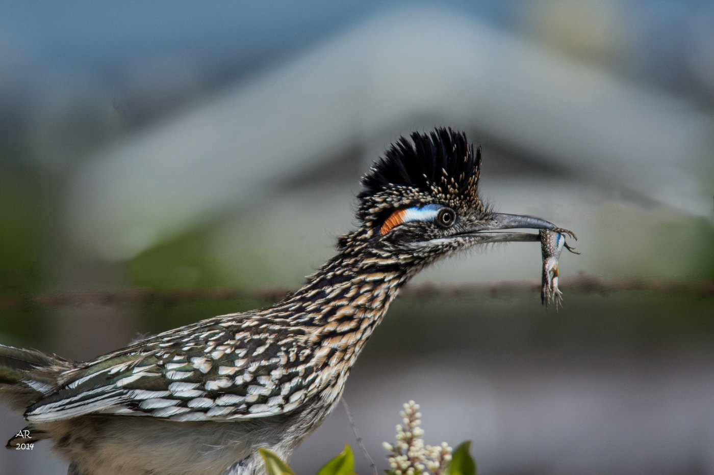 I mean that quite literally. Roadrunners are feeble fliers but they can definitely beat feet. Angling the body forward to nearly parallel with the ground as they pick up speed, the tail is held flat, acting as a stabilizer during turns. Their unmistakable X-shaped feet, with two toes pointing forward and two toes pointing backwards, are better suited to life on the run than the typical three-one toe formation of perching bird species. And who needs powerful wings when you can leap skyward, as if propelled by a pogo stick, to grab a snack out of thin air?