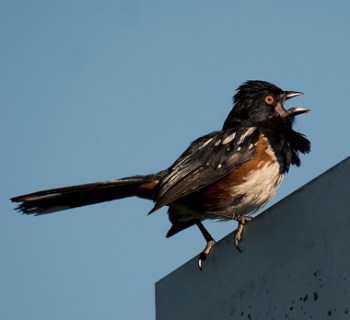 I peered skyward and saw the black, white, and terra cotta of an Eastern towhee (Pipilo erythrophthalmus). I’ve read descriptions of this bird’s call as “Drink your tea!” but to my ears it sounds like, “Drink your tea-hehehehe!”