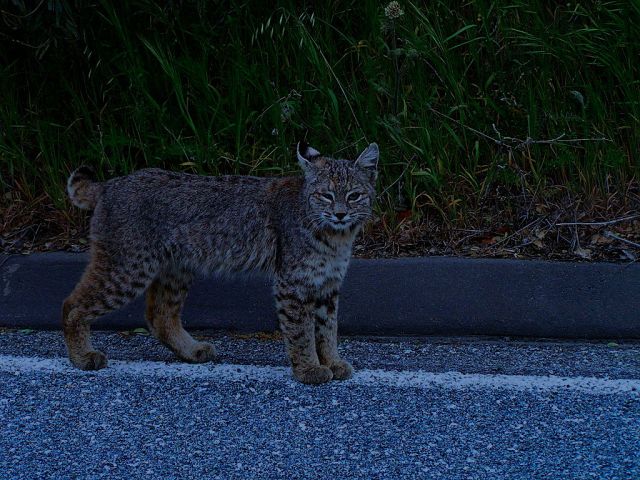 When their home venue is in the hinterlands, bobcats generally start warming up at twilight, jam until ’round midnight, break for a long intermission, then encore from dawn until a few hours after sunrise. That said, it’s not uncommon to see this intrepid player prowling their turf in broad daylight. It all depend on circumstances and the season; in this business a cat has to be flexible enough to bend with the beat.