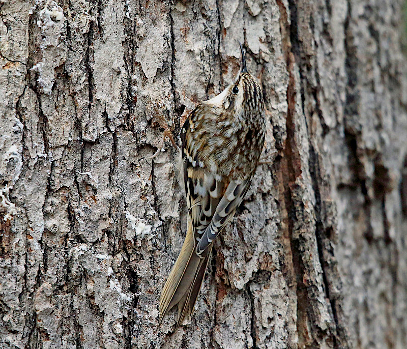 Clinging close to the surface and supported by a generously starched tail, a brown creeper will ratchet up the bole, probing the textured surface as it rises for burrowing beetle larvae and other edible grub with its slim parentheses bill, then rappel to the roots and begin another climb.  It’s this iconic and conspicuous ascension on an invisible spiral staircase that offers the most reliable way to discover and accurately identifying a bird that could otherwise easily be mistaken for a dried leaf.