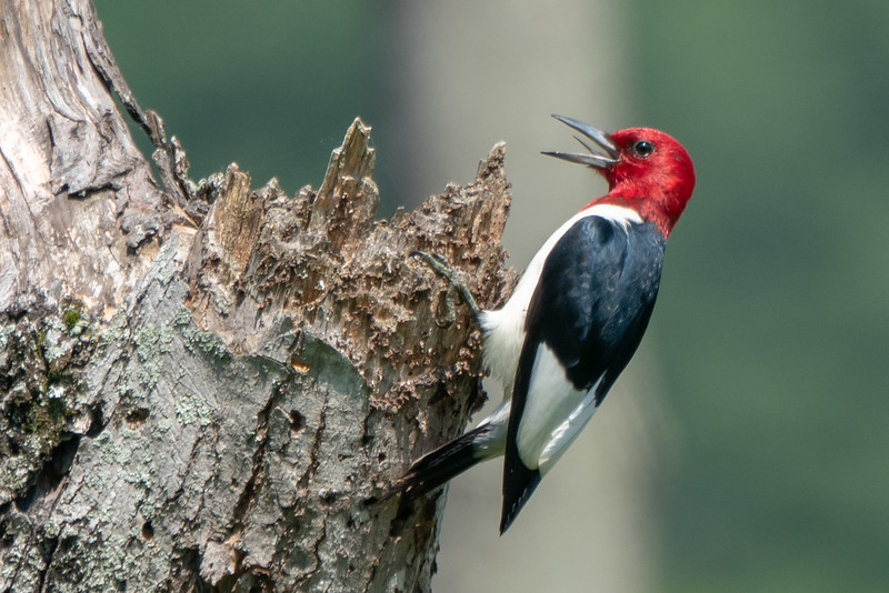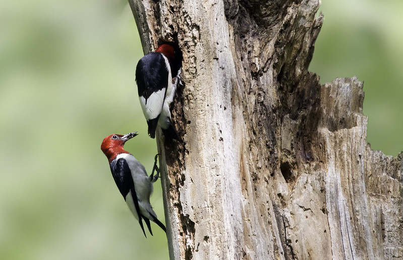 Furthermore, while at first glance Red-Headeds appear to be mild-mannered, real life isn’t all fun and games. Beneath those flaming manes you’ll find fiercely protective parents who’ll defend nest, nestlings, and territory against all comers, including snakes, raccoons, and gray foxes. RHWs are known to go on offense, picking fights with other avian species, including their woodpecker kin.