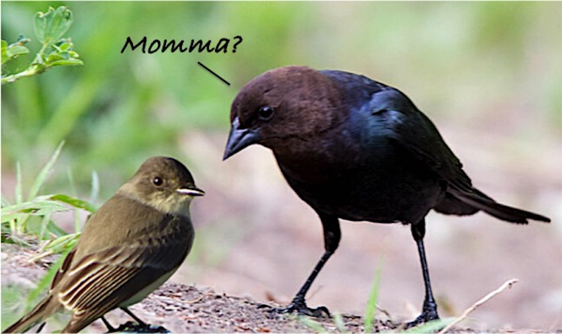 Well, not exactly like that because: 1) phoebes and cowbirds aren’t as closely related as Phoebe and Frank, Jr.; and b) Phoebe gave birth to the triplets then handed them over to Frank, Jr. and Alice to raise but cowbirds don’t come back for their children once a phoebe finishes incubating them.
