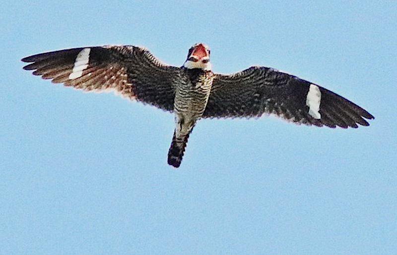 Of course, during these long hauls they grab their meals on the fly… but that’s just standard operating procedure for a nighthawk. It’s the logistics of refueling, for the day or for an expedition, that observers will find startling and astonishing. The abbreviated bill turns out to be the latch that unlocks a gaping maw of mouth, a funnel with which the nighthawk scoops winged insects out of thin air.