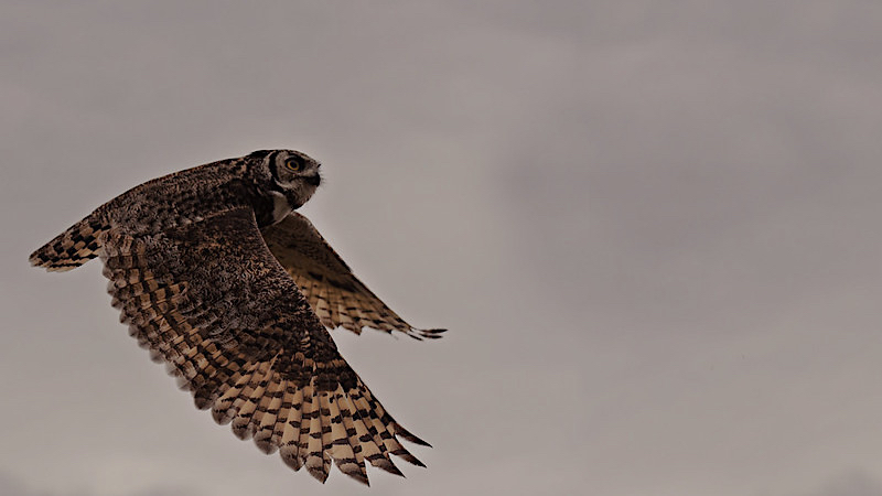 While most birds’ primaries — flight feathers along the outer edge of a bird’s wing — have a honed edge that cuts through the air with each up and down stroke, creating an audible sound, an owl’s primary feathers look as if a hairstylist has textured the edge with a razor, and the irregular edge doesn’t deliver a decisive slice. As such, when GHOs and their brethren fly, and especially under cover of darkness, their movements are imperceptible to bystanders and prey alike. Unless you happen to be looking in the right direction, of course.