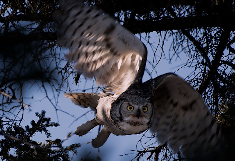 Their go-to hunting technique consists of sitting quietly in a tree or other elevated perch, watching and waiting for a potential meal to mosey along, then dropping down without a sound for the pickup. If their target spots the descending threat in time to sprint away the GHO will pursue by air, and the mark will have a difficult time knowing which way to zig or zag because of the lack of auditory cues from those whisper-edged feathers.