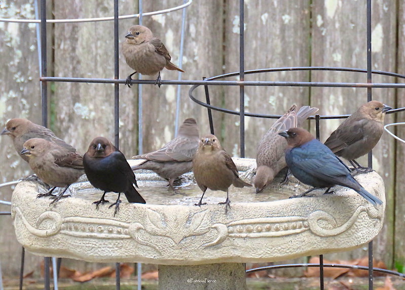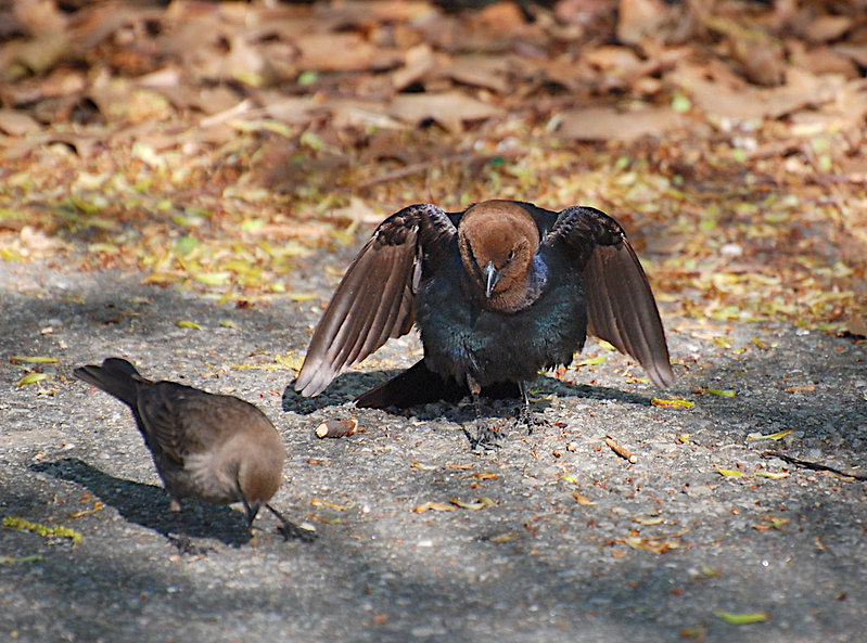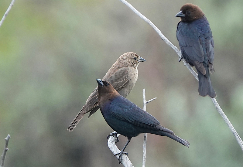 Small in comparison to other members of the blackbird family, a casual observer could easily mistake this sturdy bird for a finch, especially the females and juveniles with their plain Jane plumage and conical seed-eater bill. Up close and personal on the sunny side of the street, an adult male BHC is an easy ID — he’s no peacock but there’s understated color to this character dressed in distinctive satin-finished bronze and prismatic ebony. When viewed from afar or when foliage is throwing shade, however, that eponymous metallurgic head fades to black and this fella’s identity becomes harder to pin down.