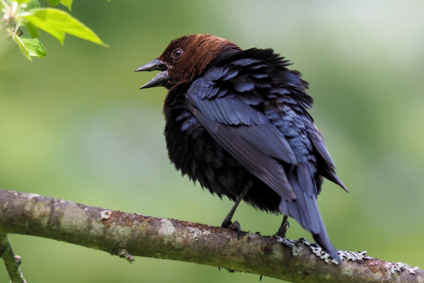 Small in comparison to other members of the blackbird family, a casual observer could easily mistake this sturdy bird for a finch, especially the females and juveniles with their plain Jane plumage and conical seed-eater bill. Up close and personal on the sunny side of the street, an adult male BHC is an easy ID — he’s no peacock but there’s understated color to this character dressed in distinctive satin-finished bronze and prismatic ebony. When viewed from afar or when foliage is throwing shade, however, that eponymous metallurgic head fades to black and this fella’s identity becomes harder to pin down.