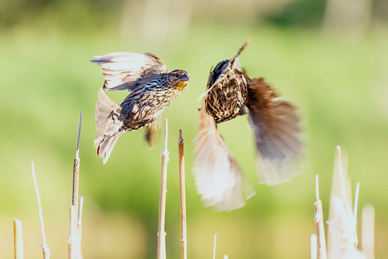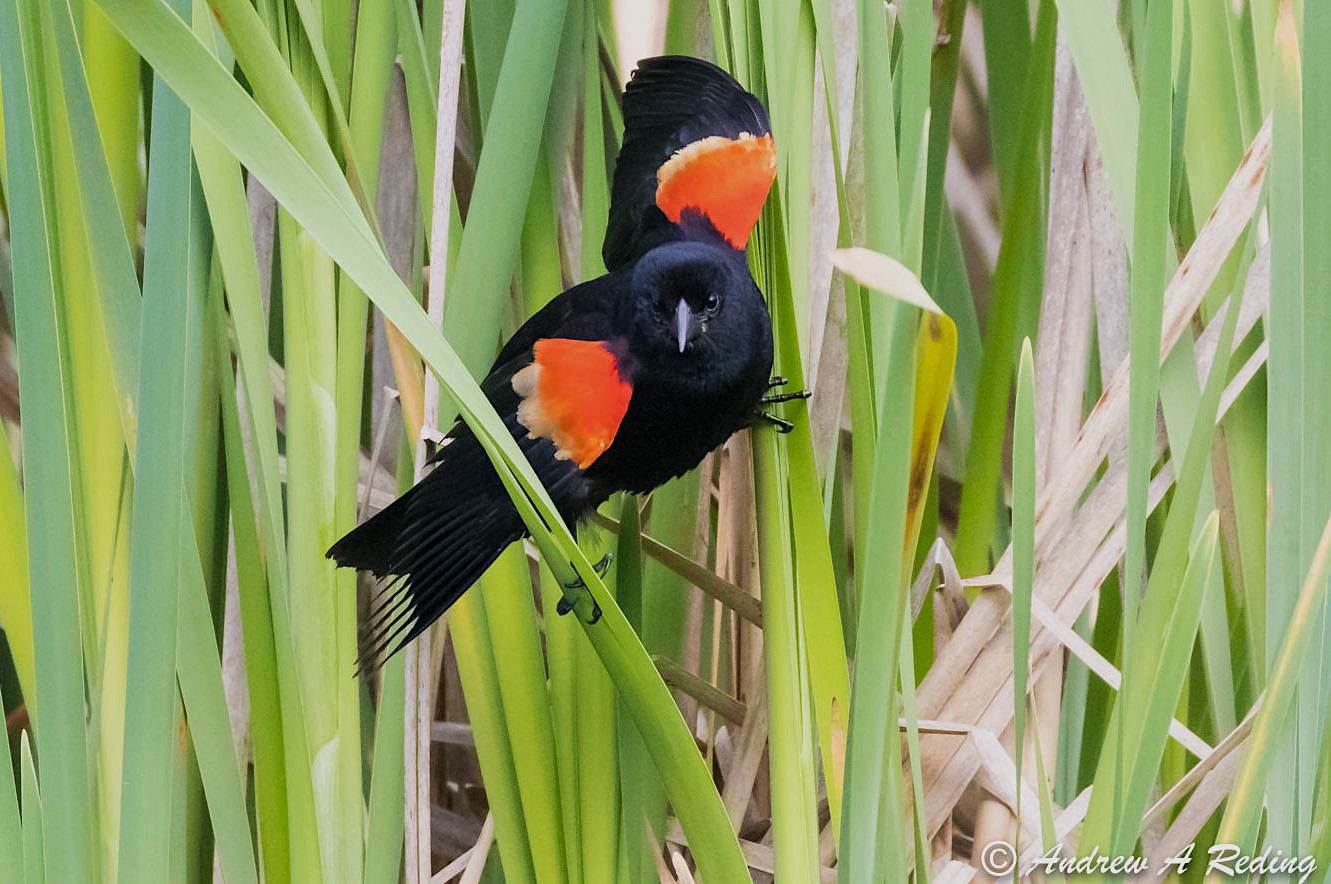 It might come as a surprise, since many female birds chose a mate based on her suitor’s ostentatious wardrobe and flamboyant dance moves, that female RWBs aren’t all that into looks. Ever pragmatic, these gals pick a baby-daddy by choosing a good neighborhood. So that explains why these guys are adamant about defending their domain against all comers, including much larger creatures such as horses and humans. Depending on the size and quality of their empire, a red-winged fella may claim conjugal rights to a harem of 5—15 consorts…