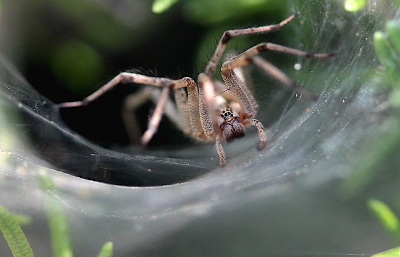 But spider webs are nearly as diverse as the creatures who create them and, once again, the American Grass Spiders are an excellent example of this. The proof is built right in to some of the alternate common names used to reference this genera — funnel web spiders or sheet web spiders. Similar in appearance to a super thin layer of cotton batting, their webs aren’t sticky but all 14 species are speedy. Detecting the telltale haptic vibration of an entangled insect, the Grass Spiders sprints out of its funnel shelter at speeds of over 1 ft/sec to dispatch a hapless grasshopper or stinkbug that lands or wanders onto the horizontal scaffolding.
