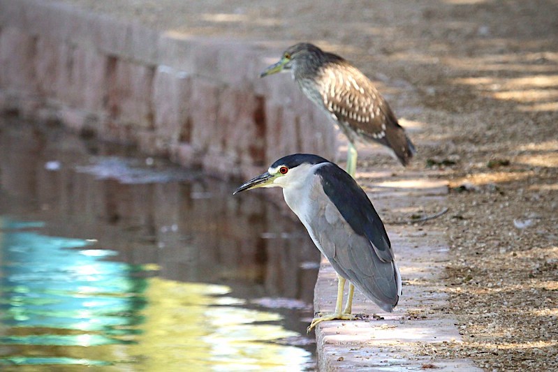 Combined with bright vermilion eyes and saffron leggings, the ensemble gave an air of upper-crust respectability, not to mention fashion-forward quirkiness, to this short, stocky, round-shouldered chap. Short (23-26 in or 58-66 cm), that is, compared to his leggier cousins the great egret and the great blue heron, who stand 1 or 2 feet taller, respectively. There are also more diminutive members of the Ardeidae Family, and truth be told, night herons looks a lot more lanky, and their posture more imposing, once they stand up to stretch and straighten out the kink in their neck.