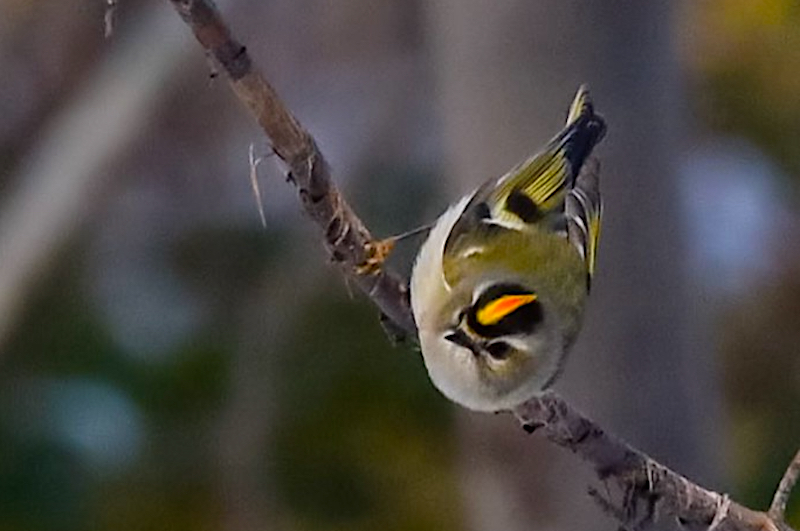 GCK winter habitat tends to be less lofty. At this time of year, these wee creatures can be found in understory shrubs or the lower branches of deciduous trees in parks, cemeteries, and backyards. But since they’re petite, somewhat inconspicuous (if you don’t count their chapeaux), and easy to overlook, here’s handy trick: by repeating a pish-pish sound you can call them in to investigate a potential intruder (and it works equally well on chickadees and warblers).