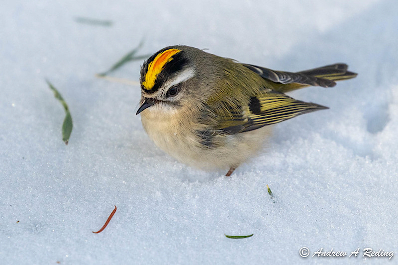 Moreover, while their larger mammalian neighbors retreat during inclement winter weather to underground dens or above-ground structures with central heating, Golden-Crowned Kinglets spend those long, frigid nights sleeping beneath the stars, alone or convening with their compatriots to consolidate body heat, even where overnight temperatures drop below -40°F. Still not impressed? Keep in mind that smaller creatures lose heat more quickly than larger critters due to their higher surface-area-to-volume ratio.
